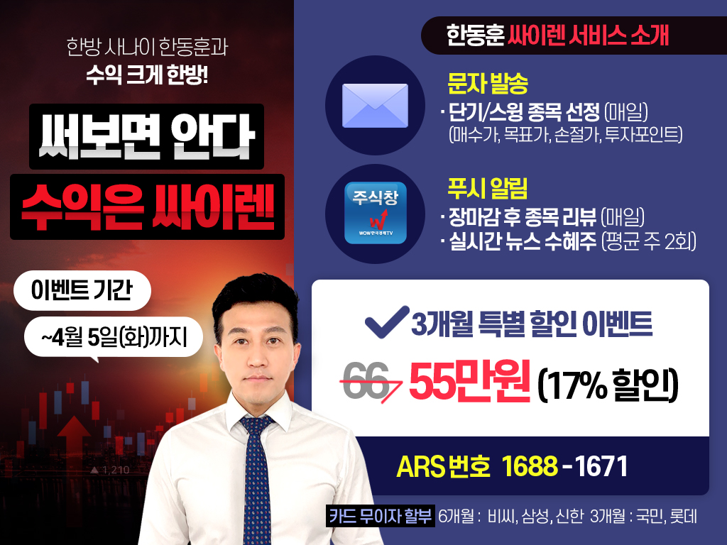 수익은 싸이렌! 3개월 특별 할인 이벤트 진행 중입니다. 해당 이벤트를 통해 가입하시면 싸이렌 서비스를 3개월 동안 17% 할인가에 이용 가능합니다. 2분기 시장 한동훈 파트너와 함께하세요!