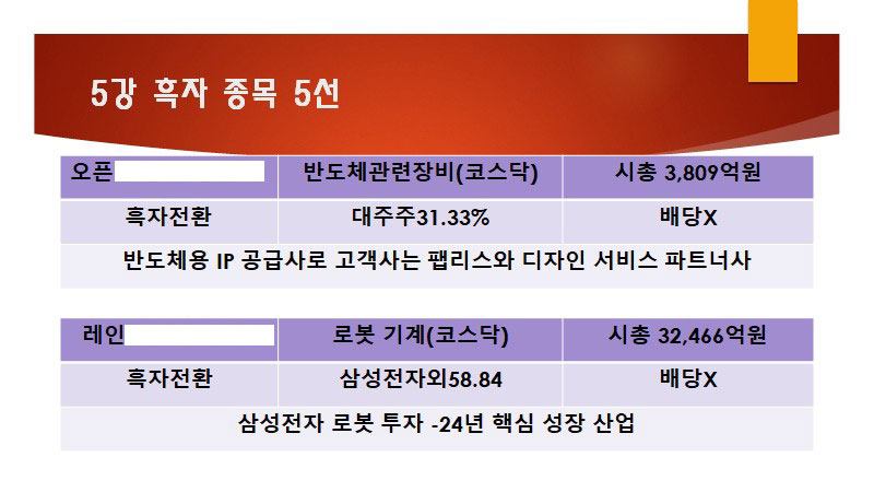 선착순 혜택으로 지급한 <2024년 흑자 전환 종목 5선> PDF 자료집 일부입니다.