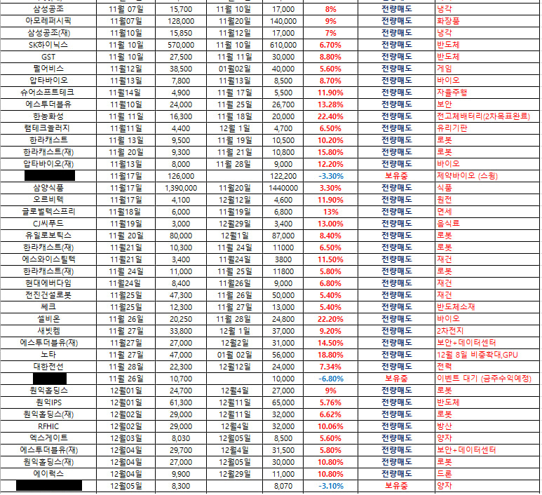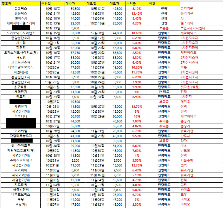 이번주, 맨 윗부분 10월 매수한 지투파워, 한농화성 등 원전과 2차전지 전고체배터리 종목들